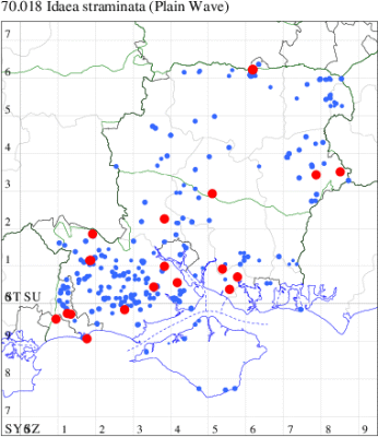 Extremely common in a wide range of habitats, including gardens, hedgerows, woodland, heathland, calcareous grassland and fens throughout the British Isles, more numerous in the south. Widespread and common in Hampshire and on the Isle of Wight. Wingspan 30-35 mm. Occurs in two distinct forms, the plain form remutata often outnumbering the typical banded form. The main confusion species are the very much more uncommon Plain Wave I. straminata and Portland Ribbon Wave I. degeneraria, which see. Larva feeds on various herbaceous plants.