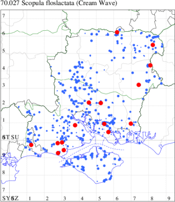 Local in broad-leaved woodland, hedgerows, damp grassland and gardens throughout much of England and Wales. In Hampshire and on the Isle of Wight fairly common, though less so than in former times, in all three vice-counties. Wingspan 29-33 mm. Similar to Lesser Cream Wave S. immutata, but larger. Larva feeds on Bedstraw, Woodruff and Bush Vetch.