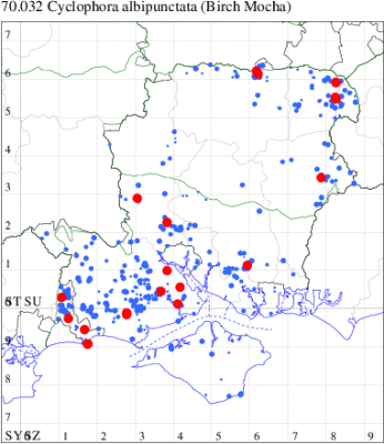 Local in beech woodland, hedgerows, parks and gardens throughout England and Wales. In Hampshire and on the Isle of Wight fairly frequent in most beech woods, with a significant concentration of records in the New Forest, but perhaps declining elsewhere. Wingspan 26-33 mm. A pitfall for the unwary, with two distinct forms; first brood most closely resembles Maiden's Blush C. punctaria, in which antemedian and postmedian lines usually reduced to a row of spots, wings irrorate, and forewing variably flushed red; second brood most closely resembles Blair's Mocha C. puppillaria, but lighter, with wing tip less distinctly hooked. Larva feeds on Beech, over-wintering as a pupa.