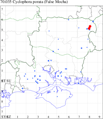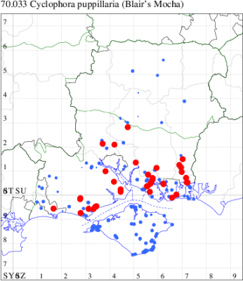 VC11: Earliest: Fareham, 13 May, 1 (ADT) Latest: Chandler's Ford, 08 Oct, 1 (KArb) Max count: Botley Wood, 09 Jun, 18 (F.M.G.)