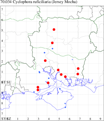 Local in woodland on Jersey, where present since at least 1917, but not recorded on the British mainland until 19 July 2003, when a female was trapped at Portland, Dorset. Now known to be resident here and in Cornwall. On the Isle of Wight, recorded for the first time at Bonchurch in August 2008, with further records at the same site in 2010 and 2011, with Hampshire's first record coming from Stubbington, in 2013. Reflecting the similar rapid spread of Blair's Mocha C. puppillaria, which see, records have become increasing in number with a distinct upturn in 2022 and 2023, by which time the species has reached the north of the county.