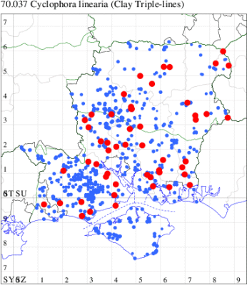 Local in oak woodland throughout much of England and Wales. In Hampshire and on the Isle of Wight still widespread and locally common, but less numerous on the chalk. Wingspan 25-32 mm. Fairly unmistakable, but worn, faded specimens could be confused with second generation Clay Triple-lines C. linearia, which see. Larva feeds on Pedunculate and Sessile Oak, over-wintering as a pupa.
