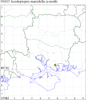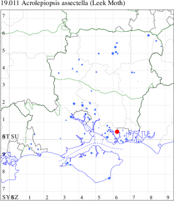 Local in gardens and allotments throughout much of south-eastern England, with records west to Devon, predominantly coastal. In Hampshire and on the Isle of Wight fairly numerous in and around Portsmouth, Havant and Southampton, with occasional records in the north of the county and on the Island. Wingspan 11-14 mm. Larva feeds within stems and roots of Leek, Onion and Chives, causing sufficient damage to be a serious pest in some areas.