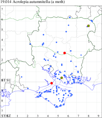 For the maps, all records prior to 2023 are shown by a blue dot (the larger the dot, the more recent), with the current year's records shown in red. As previous records are superimposed on any report for 2023, new sites have greater emphasis (i.e. will show as 'more red').