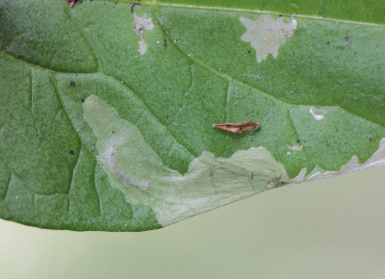 VC10: Ventnor, larva, present, field obs., several mines, with larvae, on leaves of Solanum laciniatum as found in previous two years. Photo19.014-10-24Jun24-1, 24 Jun (PBard); Lake Cliff, mine, two, tenanted mines in Solanum aviculare (Kangaroo-apple), 11 Jun; pupa, one, field obs., 17 Jun; one, field obs., eclosed a.m. from the pupa photographed on 17 June, ex tenanted leaf mine collected on 11 June, 27 Jun (IOu);