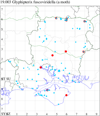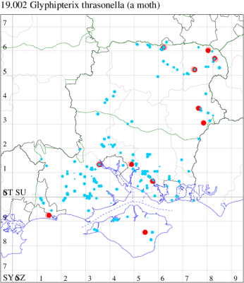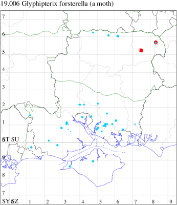 Common in a wide range of marginal, aquatic habitats, including bogs, damp heathland and mosses, throughout the British Isles. Widespread and fairly common in Hampshire and on the Isle of Wight. Wingspan 10-15 mm. Generally considered to be day-flying, but often recorded over-night at light traps. The Glyphipterix form a distinctive group, in which the forewing has a characteristic bulge in the costal half of the termen, and appears distinctly folded longitudinally, although G. fuscoviridella is atypical. G. thrasonella has a diagnostic elongate coppery black mark at tonus, which include three silver dots (MBGBI Vol 2). Larva believed to feed within stems of various species of Rush, although the exact foodplant is uncertain.