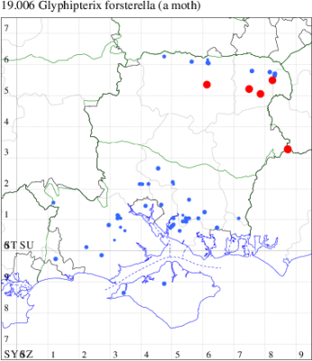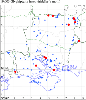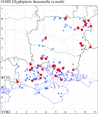 Common in a wide range of marginal, aquatic habitats, including bogs, damp heathland and mosses, throughout the British Isles. Widespread and fairly common in Hampshire and on the Isle of Wight. Wingspan 10-15 mm. Generally considered to be day-flying, but often recorded over-night at light traps. The Glyphipterix form a distinctive group, in which the forewing has a characteristic bulge in the costal half of the termen, and appears distinctly folded longitudinally, although G. fuscoviridella is atypical. G. thrasonella has a diagnostic elongate coppery black mark at tonus, which include three silver dots (MBGBI Vol 2). Larva believed to feed within stems of various species of Rush, although the exact foodplant is uncertain.