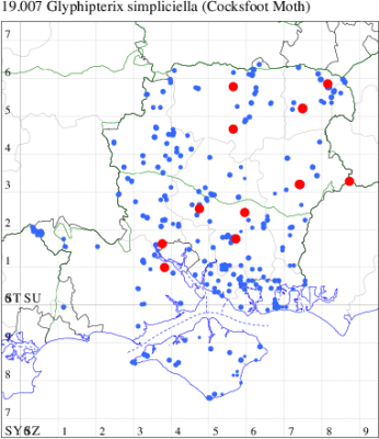 Common in dry grassland throughout much of England, Wales and south-eastern Scotland. In Hampshire and on the Isle of Wight widespread in all three vice-counties. Wingspan 10-16 mm. Day-flying. Quite distinct amongst the Glyphipterix species by reason of its plain brassy forewing and straight termen, the latter distinguishing it from plain forms of G. thrasonella (MBGBI Vol 2). Larva feeds within stems of Field Wood-rush.