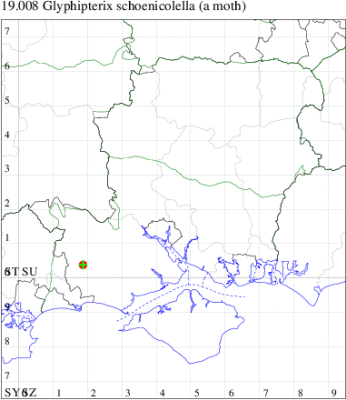 Nationally scarce (Na) in fens, bogs and dune slacks from Dorset to Cornwall, in the fens of East Anglia, in the west and north of Scotland and in the west of Ireland. In Hampshire the foodplant occurs very locally in the New Forest, but the moth had not been found until February 2023, when Jack Oughton found larva to be plentiful in the Burley area. There is a single old record from the Isle of Wight. Wingspan 6-9 mm. The adult moth is very similar to Cocksfoot Moth G. simpliciella, but in G. schoenicolella the forewing is more evenly coloured, hardly tinged with copper in apical third; costal strigulae less evenly spaced, usually a larger gap between third and fourth from base: hindwing dorsal cilia whitish-tipped, becoming entirely white towards base (MBGBI Vol 2). Larva feeds within ears of Black Bog-rush Schoenus nigricans, over-wintering in a cocoon.