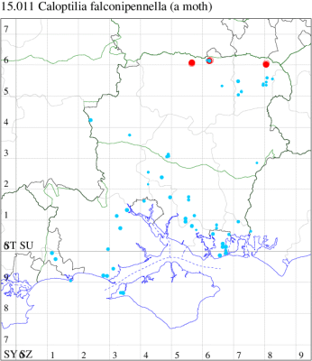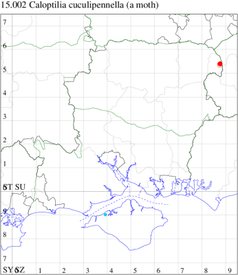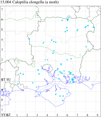 Common in woodland, gardens, parks and fens throughout much of Britain, a recent colonist, reported for the first time only in 1970. By the time of MBGBI 2 (1986), the population was centred in Scotland and eastern England, and it has evidently continued to spread westwards since that time. First recorded in south Hampshire in 1990 and 1991, and has now been found throughout Hampshire and the Isle of Wight. Wingspan 11-12 mm. Similar to C. elongella and C. betulicola, which are larger (14-16 mm) and lack the pale band on the foretibia and the white admixture on the midfemur. Overwinters as an adult, often in an evergreen such as Yew. Larva mines leaves of Sycamore and occasionally other species of Acer, subsequently living within a leaf-fold, sometimes the most frequent Caloptilia species in gardens.