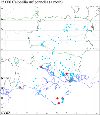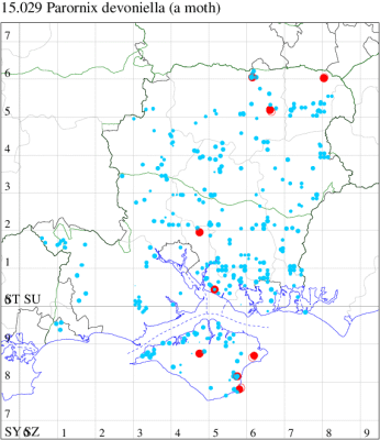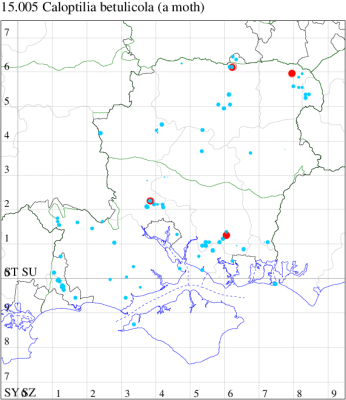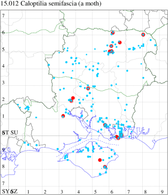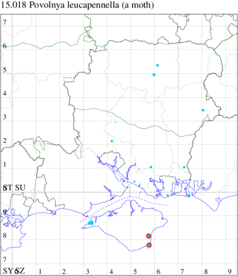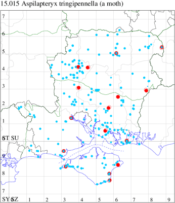 VC11: Woodlands, New Forest, present, 31 May (RBW); Romsey, one, 10 Jun (SLay); one, 08 Aug; one, 07 Nov (MB); one, 18 Mar; one, 04 Aug (NRJ); Dibden Purlieu, one, to actinic, 09 Aug (RAC); Southampton, one, 22 Apr; one, 26 May (MEdg); Eastleigh, one, to actinic, 04 Aug (KArb); Winchester, one, 10 Apr (THW); Botley Wood, one, 13 Mar; one, 18 Sep (F.M.G.); Fareham, one, to actinic, 29 Jul (MLO); Botley, one, to actinic, 05 Aug (SLB); Wickham, one, 16 Jul (JRDS); Portsmouth, one, 07 Aug; one, 09 Nov (IRT); West Meon, one, 31 Jul (F.M.G.); Sway, one, 01 Apr (SKe); Pilley Bailey, NF, two, 03 Aug (RBW, MWa); Southsea, one, 26 May (JRL);
