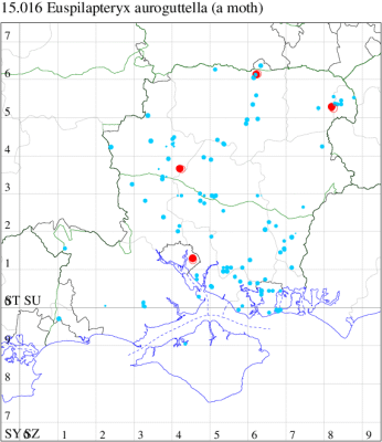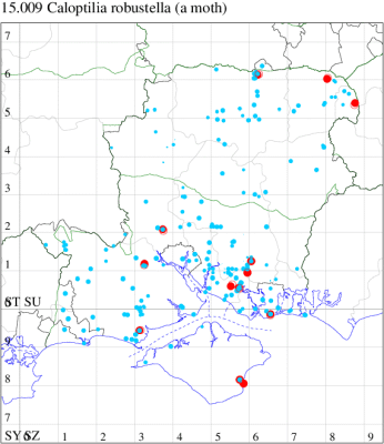 In Hampshire and on the Isle of Wight seemingl more common than C. alchimiella, although the true distribution of records historically is unknowable due to many records not being supported by critically examined specimens: robustella was only separated from alchimiella in 1972 and for many years, with reference to Heath & Emmet (1985) : 'The Moths and Butterflies of Great Britain and Ireland, Vol. 2', the two species could be differentiated externally by a number of characteristics;