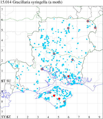 VC10: Plaish, mine, present, several on garden privet, 24 Sep (KRy); Walter's Copse, Newtown, mine, present, blotch mines on leaves of Fraxinus excelsior, 15 Sep (PBa); Merstone, mine, present, several on garden privet, 27 Sep (KRy); Shanklin, one, 24 Jun (IOu);