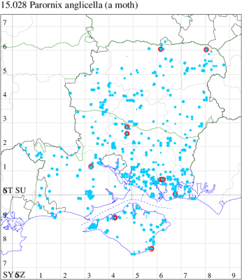 Common in gardens, hedgerows and woodland throughout much of the British Isles to Perthshire, north of which it is more local and rare. In Hampshire and on the Isle of Wight common and widespread. Wingspan 9-11 mm. Similar to P devoniella, which has the ground colour paler and the dark markings more distinct and, on the underside, a distinct white line in the terminal cilia which is continued round the apex to unite with the costal strigula nearest the apex; in P. anglicella this line is more obscure and stops at the apex, not reaching the anteapical strigula (MBGBI Vol 2). Easily disturbed from its foodplants, around which it can be found flying from late afternoon, and it occasionally comes to light, but more frequently recorded in the larval stage, when mines are relatively easy to find where they are present. Larva mines leaves of Hawthorn and Wild Service-tree, subsequently living within a leaf-fold, over-wintering as a pupa in a cocoon.