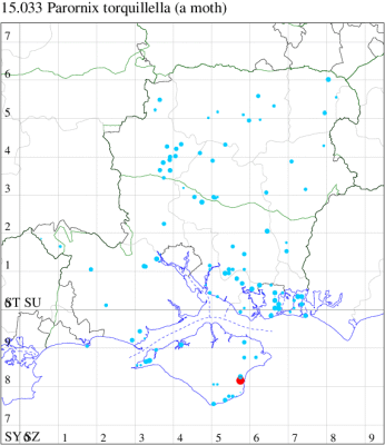 VC11: Totton, one, 30 Jun; one, 07 Jul (LH); Eastleigh, one, to actinic, 07 Aug (KArb); Fareham, one, to actinic, gen det, 09 Aug (MLO det. RJD); Portsmouth, one, 18 Jul; one, 21 Jul (IRT); Milton, vacated mine, two, Quercus ilex, 06 Feb; vacated mine, two, Quercus ilex, 06 Nov (JRL, IRT);