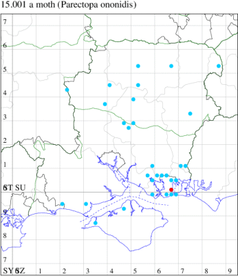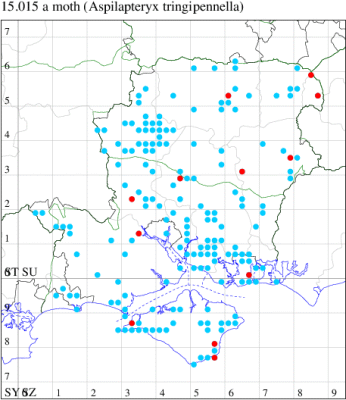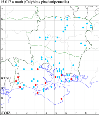VC11: Ashley Heath, one, 10 Sep (SDut); Woodlands, NF, present, 19 Jul (RBW); Brownwich cliffs, one, 17 Sep (RJD, MLO, DWal, KJW det. RJD); Fareham, one, plain form - confirmed by Richard Dickson, 08 Oct (ADT); Portsmouth, one, 19 Jul; one, 17 Sep (IRT); Merritown Heath, present, 10 Jun (DFoo); Tuckton, Christchurch, one, 11 Aug (APar); Pennington, one, 07 Oct (RFC); Needs Ore NNR, one, 19 Aug (PCra); one, 09 Nov; two, 18 Aug (CNB); one, 19 Aug (PCra)