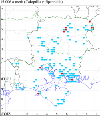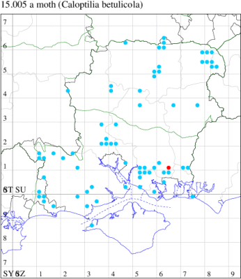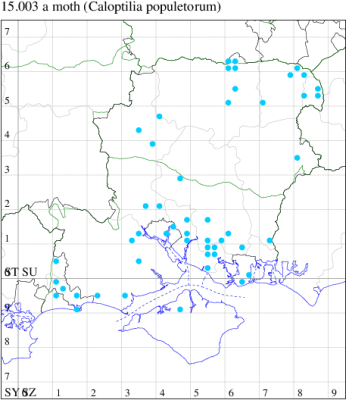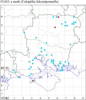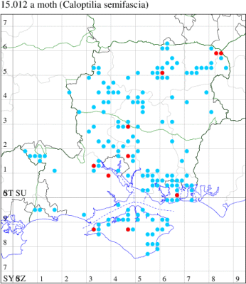 Common in woodland, gardens, parks and fens throughout much of Britain, a recent colonist, reported for the first time only in 1970. By the time of MBGBI 2 (1986), the population was centred in Scotland and eastern England, and it has evidently continued to spread westwards since that time. First recorded in south Hampshire in 1990 and 1991, and has now been found throughout Hampshire and the Isle of Wight. Wingspan 11-12 mm. Similar to C. elongella and C. betulicola, which are larger (14-16 mm) and lack the pale band on the foretibia and the white admixture on the midfemur. Overwinters as an adult, often in an evergreen such as Yew. Larva mines leaves of Sycamore and occasionally other species of Acer, subsequently living within a leaf-fold, sometimes the most frequent Caloptilia species in gardens.