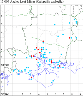 Local in parks, gardens and woodland throughout much of southern England, spreading into northern England. Thoroughly naturalised, through accidental introduction in azaleas and rhododendrons, this native of eastern Asia now occurs in the wild amongst Azalea species in several of the southern counties and more widely in greenhouses. In Hampshire early stages were first reported in a garden at Bournemouth, and subsequently from Southampton, Hilliers Arboretum and Ampfield. A few adult specimens have been taken at light elsewhere in southern Hampshire, but still rare in the north of the county and on the Isle of Wight, where first recorded at Totland in 2007. Wingspan 10-11 mm. Larva mines leaves of Azalea and Rhododendron, subsequently living within a leaf-fold, over-wintering as a pupa.