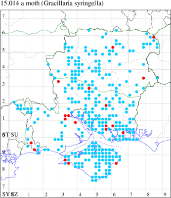 Common in gardens and woodland throughout the British Isles, as far north as Shetland. Widespread and common in Hampshire and on the Isle of Wight, where the distribution of records show continuous presence from April to September with only a small trough in June, indicating protracted emergence of the first generation. Wingspan 10-13 mm. Imago seldom encountered at light, and more likely to be recorded in the larval stage, when mines are relatively easy to find where they are present. Beware confusion with the far rarer C. cuculipennella. Larva mines leaves of Privet (both wild and cultivated), Ash and Lilac, subsequently living gregariously within a leaf-roll, causing sufficient damage to be a serious pest in some areas, over-wintering as a pupa.