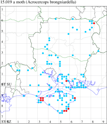 In Hampshire and on the Isle of Wight probably markedly less common than C. robustella, although the true distribution of records historically is unknowable due to many records not being supported by critically examined specimens: C. alchimiella was only separated from robustella in 1972 and for many years, with reference to Heath & Emmet (1985) : 'The Moths and Butterflies of Great Britain and Ireland, Vol. 2', the two species could be differentiated externally by a number of characteristics: