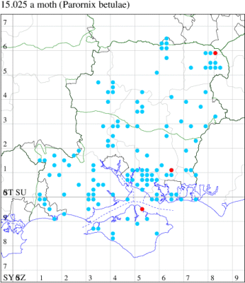 VC11: Fareham, one, 09 Sep (MLO det. ); Great Salterns NR, Portsmouth, larval feeding signs, present, field observation, 30 Sep (MRY, JRL); Portsmouth, Tamworth Park, larva, one, field observation, on Prunus sp, 23 Sep (IRT, JRL det. IRT); Milton Common, larval feeding signs, present, field observation, 28 Sep (MRY, JRL)