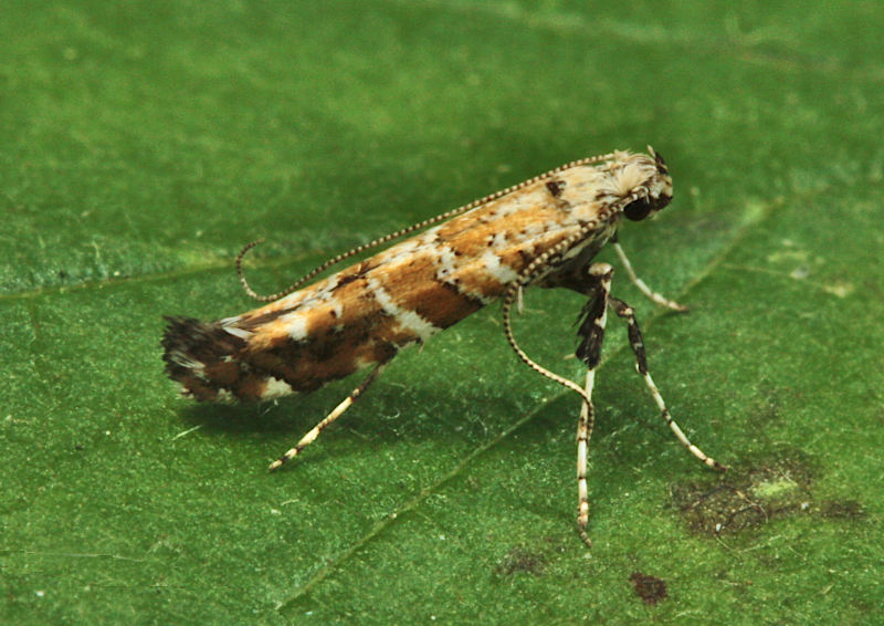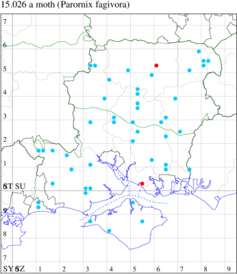Local in woodland in an area bounded by Kent, Dorset, Herefordshire and Cambridgeshire and also from Lancashire and west Yorkshire. In Hampshire recorded from most 10km squares in the south, but distinctly rare in the north and on the Isle of Wight. Wingspan 9-10 mm. The ochreous or fawn tinge of the pale markings and the lack of definition in the pattern help to distinguish this species (MBGBI Vol 2). Imago seldom encountered at light, and more likely to be recorded in the larval stage, when mines are relatively easy to find where they are present. Larva mines leaves of Beech, subsequently living within a leaf-fold, over-wintering as a pupa in a cocoon.