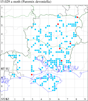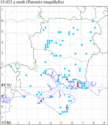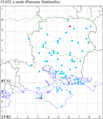 Common in scrub, woodland, hedgerows and gardens throughout much of the British Isles. In Hampshire and on the Isle of Wight widespread. Wingspan 9-10 mm. Very similar to Parornix finitimella, which see for differences. Imago fairly regular at light, but more frequently recorded in the larval stage, when mines are relatively easy to find where they are present. Larva mines leaves of Blackthorn and Wild Plum, subsequently feeding in the fallen leaves, over-wintering as a pupa in a cocoon.