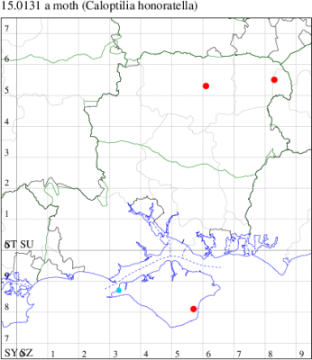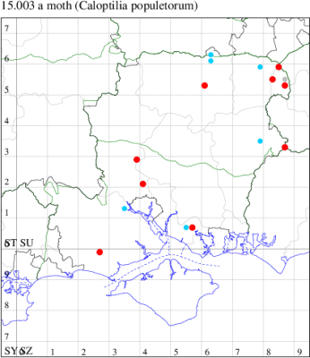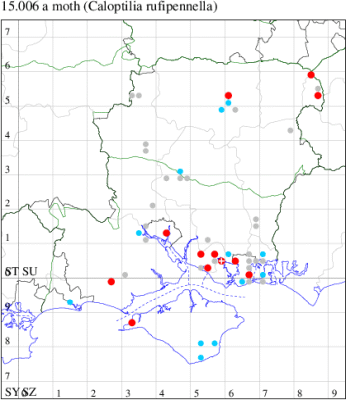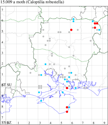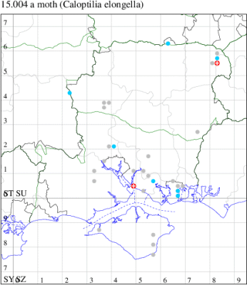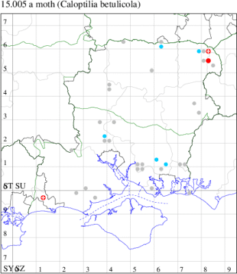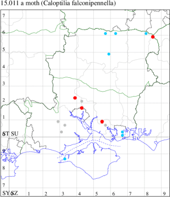 Common in woodland, gardens, parks and fens throughout much of Britain, a recent colonist, reported for the first time only in 1970. By the time of MBGBI 2 (1986), the population was centred in Scotland and eastern England, and it has evidently continued to spread westwards since that time. First recorded in south Hampshire in 1990 and 1991, and has now been found throughout Hampshire and the Isle of Wight. Wingspan 11-12 mm. Similar to C. elongella and C. betulicola, which are larger (14-16 mm) and lack the pale band on the foretibia and the white admixture on the midfemur. Overwinters as an adult, often in an evergreen such as Yew. Larva mines leaves of Sycamore and occasionally other species of Acer, subsequently living within a leaf-fold, sometimes the most frequent Caloptilia species in gardens.