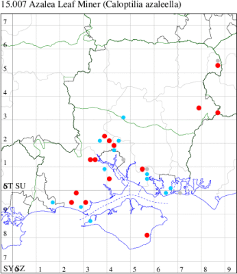 Local in parks, gardens and woodland throughout much of southern England, spreading into northern England. Thoroughly naturalised, through accidental introduction in azaleas and rhododendrons, this native of eastern Asia now occurs in the wild amongst Azalea species in several of the southern counties and more widely in greenhouses. In Hampshire early stages were first reported in a garden at Bournemouth, and subsequently from Southampton, Hilliers Arboretum and Ampfield. A few adult specimens have been taken at light elsewhere in southern Hampshire, but still rare in the north of the county and on the Isle of Wight, where first recorded at Totland in 2007. Wingspan 10-11 mm. Larva mines leaves of Azalea and Rhododendron, subsequently living within a leaf-fold, over-wintering as a pupa.