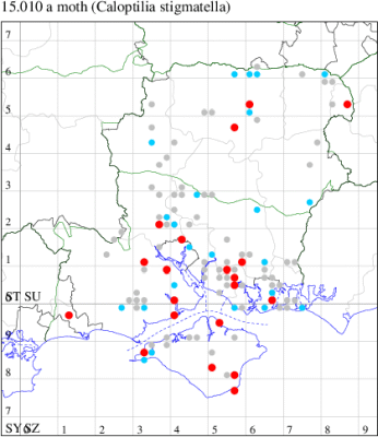 Nationally scarce (Nb) in oak woodland throughout much of Britain and Ireland. Rather uncommon in south Hampshire and very rare in the north and on the Isle of Wight. Wingspan 12-14 mm. Very variable, from pale yellowish white to reddish, and some forms are only separable from other similar Caloptilia species by dissection of the genitalia; however, the more common form is off white with darker spots, and this is distinctive. The mines on oak are very rarely reported; the few reports we have relate to adults taken at light or beaten from scrub.