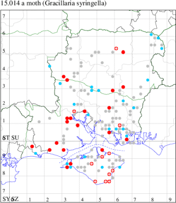 Scarce in Britain as far north as Perthshire and in Ireland, especially on sea-cliffs and rough ground near the sea and woodland inland. Very rare in our area: Ffennell reported one from the Southampton area in 1935, and there are three old records from the Isle of Wight. Recent years have seen a scattering of further examples, with the first for North Hampshire coming in 2020. Wingspan 11-12 mm. Beware confusing the far more widespread and common C. syringella. Larva mines leaves of Ash and Wild Privet, subsequently living within a leaf-fold.