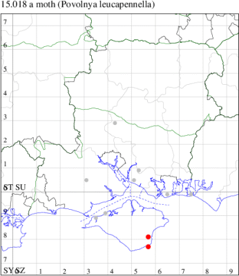Local in damp woodland, fens and cornfield edges throughout much of England, rare in Scotland and Ireland. In Hampshire and on the Isle of Wight recorded from all three vice-counties, but evidently rare and taken mostly as single specimens. Wingspan 10-11 mm. Imago fairly regular at light, but more frequently recorded in the larval stage, when mines are relatively easy to find where they are present. Larva mines leaves of Redshank, Black-bindweed, Common Sorrel, Sheep's Sorrel, Broad-leaved Dock, Water Dock and Yellow Loosestrife, subsequently living within a leaf-roll.