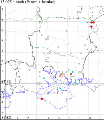 VC11: Titchfield Common: Kites Croft LNR, mine, three, 3 mines, 14 Oct; Botley Wood, larva, 10, field observation, 10+ leaf-folds, one larva seen, 09 Oct (DPH); Place Wood, Southwick, larval spinning, one, on host-plant, fold on birch, 23 Aug (IRT);