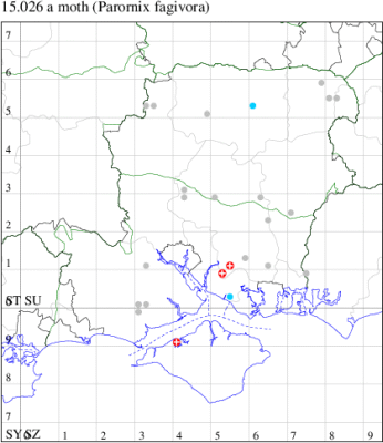 Local in woodland in an area bounded by Kent, Dorset, Herefordshire and Cambridgeshire and also from Lancashire and west Yorkshire. In Hampshire recorded from most 10km squares in the south, but distinctly rare in the north and on the Isle of Wight. Wingspan 9-10 mm. The ochreous or fawn tinge of the pale markings and the lack of definition in the pattern help to distinguish this species (MBGBI Vol 2). Imago seldom encountered at light, and more likely to be recorded in the larval stage, when mines are relatively easy to find where they are present. Larva mines leaves of Beech, subsequently living within a leaf-fold, over-wintering as a pupa in a cocoon.