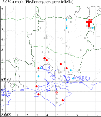 VC10: Totland, one, 25 Jul; one, 03 Sep (RTer); Little Pan, Newport, mine, present, numerous mines in Quercus robur, cocoons completely covered in frass, now vacated, 25 Jul; Shanklin, one, 20 Apr (IOu);