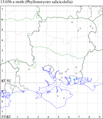 Scarce in damp woodland throughout England. Wingspan 8 mm. Larva mines leaves of White Poplar and Grey Poplar, often favouring isolated, young saplings. In Hampshire first identified as a mine on poplar leaves at Butterwood near Hook, VC12 in 2007 (also reported from the Hants/Surrey border in 2021); subsequently found to be locally common in the Portsmouth area with records from 2019 to date. Not recorded from the Isle of Wight to date.