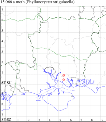 Common in damp woodland throughout much of Britain, but in Ireland known only from the Burren. Probably under-recorded in Hampshire and on the Isle of Wight, where the extent of known records correlate with those areas in which the recording effort is concentrated. Wingspan 9-10 mm. Imago similar to P. stettinensis, P. tristrigella, P. nicellii and P. kleemannella, but is by far the largest species in the group, its copper-brown ground colour is characteristic, it has the narrowest and most sharply defined black edging to the white markings and the first pair of strigulae are smoothly curved distad with their apices almost touching to form an acute- or right-angled chevron (MBGBI Vol 2). Imago seldom encountered at light, and more likely to be recorded in the larval stage, when mines are relatively easy to find where they are present. Larva mines leaves of Alder, over-wintering as a pupa in a cocoon.