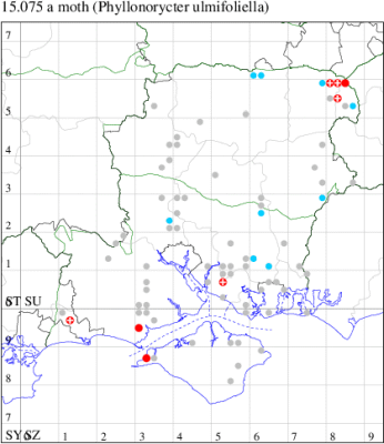 Common in hedgerows in England and Wales. In Hampshire mines are widespread and common on Elm in both vice-counties, and evidently also widespread on the Isle of Wight. Wingspan 7.5-8.5 mm. Imago differs from P. stettinensis, P. froelichiella, P. nicellii and P. kleemannella in having the white pattern much less metallic and its black edging fading more evenly into the ground colour. Imago seldom encountered at light, and more likely to be recorded in the larval stage, when mines are relatively easy to find where they are present. Larva mines leaves of Wych Elm, English Elm and Small-leaved Elm, over-wintering as a pupa in a cocoon.