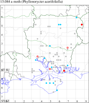 VC10: Afton Marsh, mine, present, found on Sycamore, 18 Sep (SDav); Brighstone Forest, vacated mine, two, old mines on Acer pseudoplatanus, 18 Sep (PBar); Lower Hamstead, mine, one, on Sycamore, 26 Jul (KRyl); St Lawrence, mine, one, underside mine on Acer pseudoplatanus, 21 Sep (PBar); Bonchurch, one, field observation, trapped by James Halsey and shoen to me at Osborne, 23 Jun; Shanklin, one, field observation, gen. det. completed 20 August, 15 Aug (IOu);