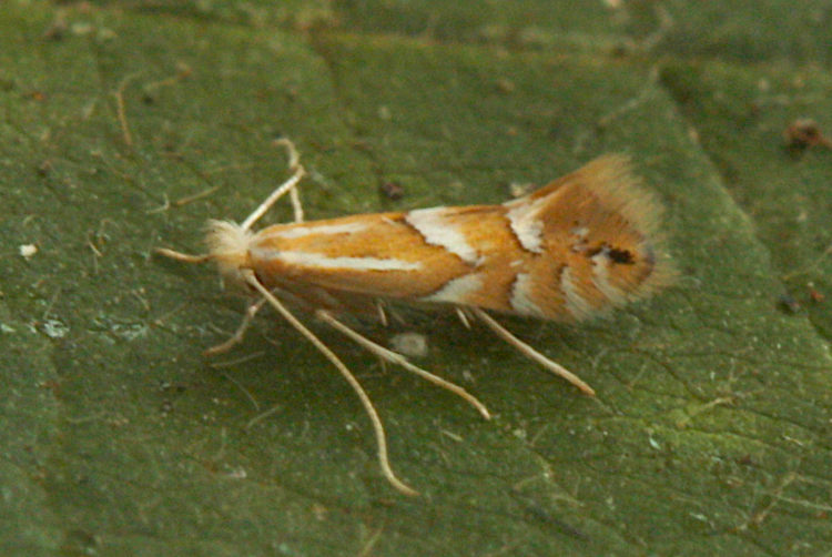 Common in woodland throughout much of the British Isles, more numerous in the north. In Hampshire fairly common in the south and north-east, but largely absent elsewhere. First recorded on the Isle of Wight at Parkhurst Forest in 1997, but not since. Wingspan 7.5-8.5 mm. Similar to P. oxyacanthae, which see for differences. Imago seldom seen at light and more frequently recorded in the larval stage, when mines are relatively easy to find where they are present. Larva mines leaves of Rowan and Bird Cherry, over-wintering as a pupa in a cocoon.