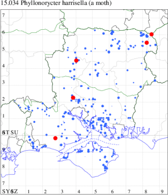 Common in woodland and hedgerows throughout England and Wales, more local in Scotland and apparently only coastal in Ireland (MBGBI Vol 2). In Hampshire and on the Isle of Wight common and widespread. Wingspan 7-8 mm. Imago fairly regular at light, but just as likely to be recorded in the larval stage, when mines are relatively easy to find where they are present. Larva mines leaves of Honeysuckle Lonicera periclymenum, but also Leycesteria formosa and Symphoricarpos.