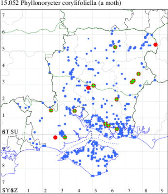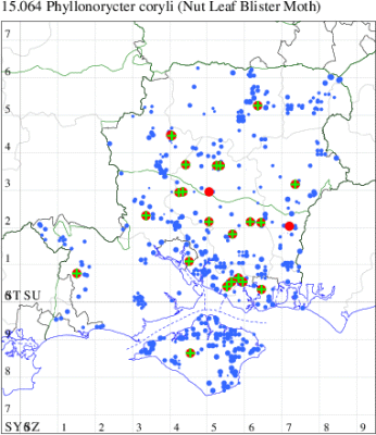 VC12: Cholderton, one, 04 Sep (TJN); South Wonston, mine, present, corylus, 08 Sep; Andover, mine, present, corylus, 01 Aug (JOug); Micheldever Wood, mine, present, 21 Sep (AMD); Tangier Park, mine, present, on hazel, 17 Oct (MJW); Noar Hill HIWWT NR, Selborne, mine, present, 23 Sep; Shortheath Common, Oakhanger, mine, present, 05 Nov (AMD); Fleet Pond, mine, one, mine on hazel, em.31 Jul, 17 Jul (MHals)