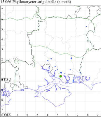 Common in damp woodland throughout much of England and Wales, and parts of western Scotland. Probably under-recorded in Hampshire or on the Isle of Wight, where the extent of known records correlate with those areas in which the recording effort is concentrated. Wingspan 6.5-7.5 mm. Imago similar to P. tristrigella, P. froelichiella, P. nicellii and P. kleemannella, but the only one of the group to have a blackish brown vertical tuft on the head. P. stettinensis may also be distinguished by its short basal streak; P. tristrigella usually has a pale basal spot, but the other species no indication even of this (MBGBI Vol 2). Imago seldom encountered at light, and more likely to be recorded in the larval stage, when mines are relatively easy to find where they are present. Larva mines leaves of Alder, over-wintering as a pupa in a cocoon.