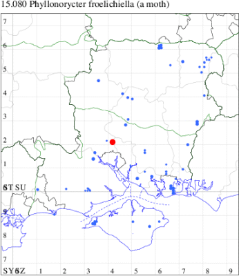 Common in marshes, river-banks and other damp areas in England and Wales, with scattered records in Scotland; rare in Ireland. In Hampshire and on the Isle of Wight locally common in the south-east of the county and around Fleet, and probably under-recorded elsewhere. Wingspan 7.5-8 mm. Imago fairly regular at light, but more frequently recorded in the larval stage, when mines are relatively easy to find where they are present. Larva mines leaves of smooth-leaved Salix species, such as Osier and Crack Willow, has also been recorded on Aspen, over-wintering as a pupa in a cocoon.