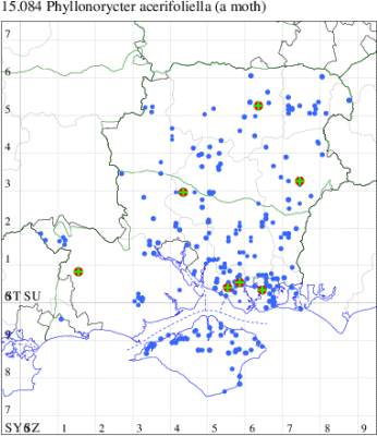 VC11: Blashford Lakes HIWWT NR*, mine, present, acer campestre, 14 Oct (JOug); Crab Wood LNR, mine, present, 13 Aug (AMD); Stubbington, mine, three, 03 Dec (DPH); Fareham, mine, four, one fresh and 3+ aging mines on Field Maple. , 15 Aug (RJD); Tipner Park & Ride, Portsmouth, mine, present, 30 Jul (AMD);
