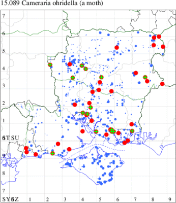 For the maps, all records prior to 2023 are shown by a blue dot (the larger the dot, the more recent), with the current year's records shown in red. As previous records are superimposed on any report for 2023, new sites have greater emphasis (i.e. will show as 'more red').