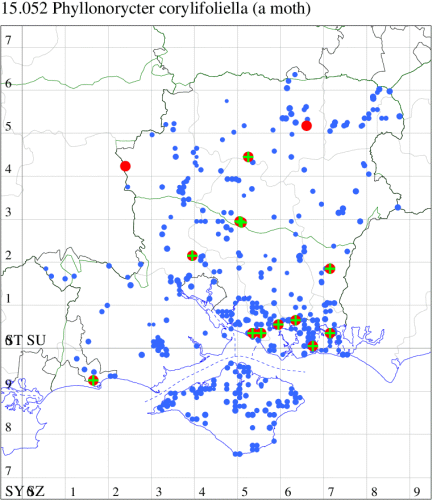VC12: Stockbridge Down, mine, present, corylus, 18 Aug; Magdalen Hill Down NR, mine, present, corylus, 18 Aug (JOug); Micheldever, mine, present, 18 Oct (AMD); Kingsclere: Frith Common, mine, present, a few on Corylus avellana, 17 Oct; Great Deane Wood area, Malshangar, mine, present, corylus, 10 Nov; Hay Wood, Malshangar, mine, present, corylus, 10 Nov; Kingsclere: Sandford Woods, mine, present, a few on Corylus avellana, 17 Oct; KIngsclere: Skittle Hill Copse, mine, present, a few on Corylus avellana, 17 Oct; Kingsclere: Wheathold Farm, mine, present, frequent on Corylus avellana, 17 Oct; Campdown, Havant, mine, present, mine on Corylus, 02 Dec; Mapledurwell: Nunnery Hill, mine, present, on Corylus avellana, 11 Nov; Mapledurwell: White Hill, mine, present, on Hazel, 11 Nov (MJW)