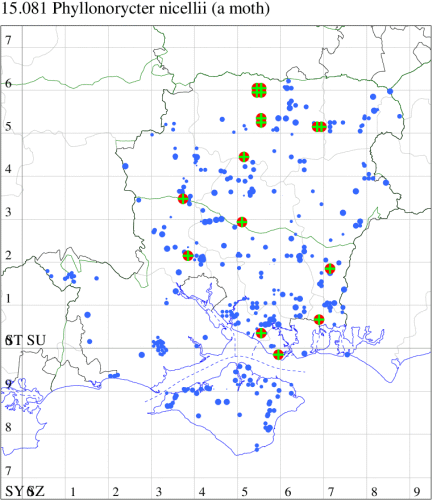 Common in woodland throughout much of the British Isles, but more plentiful in the south. In Hampshire and on the Isle of Wight widespread and common. Wingspan 7-8 mm. Imago similar to P. stettinensis, P. tristrigella, P. froelichiella and, especially, P. kleemannella. P. kleemannella and P. nicellii are two of the more difficult of the group to distinguish. P. kleemannella has a deeper orange ground colour, the fasciae are more shining and often bordered inwardly by a broad band of deep coppery brown rather than the brown irroration of P. nicellii; the first pair of strigulae rarely meet. In P. nicellii the first pair of strigulae often touch, forming a third angulated fascia (MBGBI Vol 2). Imago seldom encountered at light, and more likely to be recorded in the larval stage, when mines are relatively easy to find where they are present. Larva mines leaves of Hazel, over-wintering as a pupa in a cocoon.