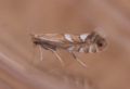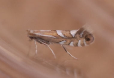 Local, in woodland, scrub and hedgerows, throughout Britain, rarely in Ireland. In Hampshire and on the Isle of Wight there are only scattered records, although possibly under-recorded. Wingspan 9-10mm. Forewing has a ground colour of light brown. There are four costal and five dorsal white strigulate, the first two pairs meeting to form distinct fascia, the first of which is irregular and varying in width, and the second pair form an obtuse angled or smooth outward-facing fascia; the third pair nearly meet at an acute angle; the fourth pair are opposite and separated from the third by a small patch of dark brown scales; dorsal 5 is immediately below apical patch. The basal streak is short and sinuate, reaching first fascia, and fascia are lightly edged with brown.