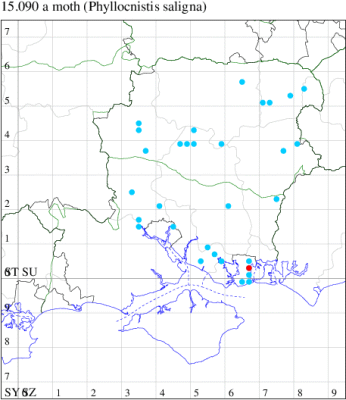 Local in fens, marshes, river-banks and other damp areas throughout southern England. In Hampshire known only from a handful of sites, including Fleet, Greywell Moors, Southsea and Leckford, but perhaps under-recorded. Not recorded from the Isle of Wight to date. Wingspan 6-7 mm. The imago can be separated from other Phyllocnistis only by dissection of the genitalia (females only, males are indistinguishable). Larva mines leaves of Purple Willow Salix purpurea. See the leafmines.co.uk newsletter that describes the mines of the four species in the complex.